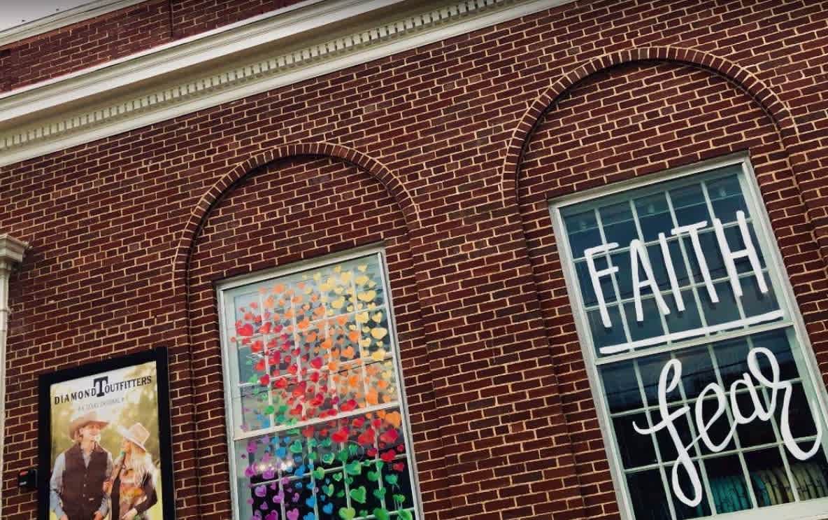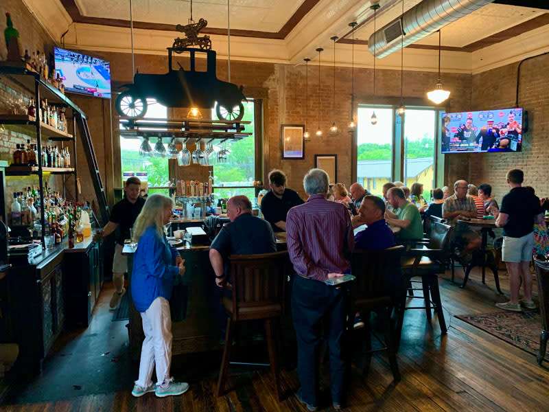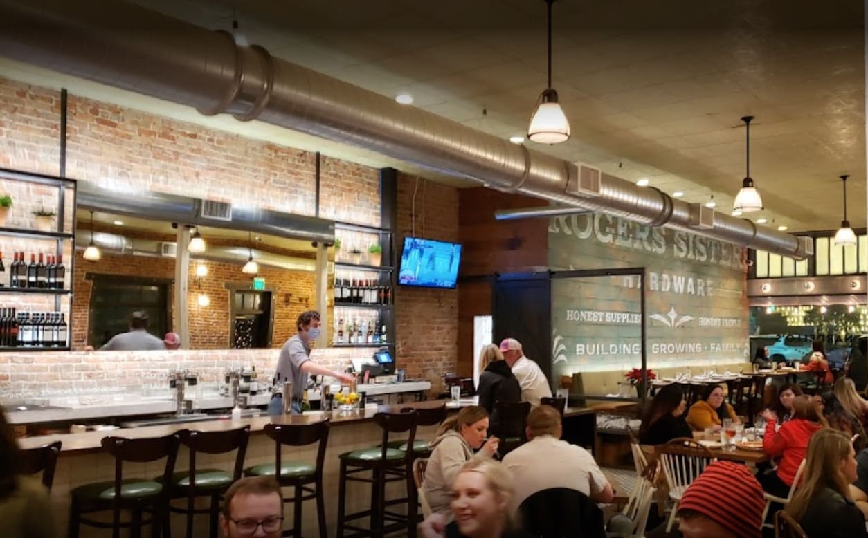 Dine on a covered patio overlooking the square, or the modern and warm ambiance of their lovingly restored 1930s building, the former Rogers Sisters Hardware Store. Their renovation of the space began in 2016, and the timeless design features original exposed brick walls, a hand-painted mural paying tribute to the building's past, and an inviting bar serving refreshing craft beers, delicious wines, and signature cocktails.