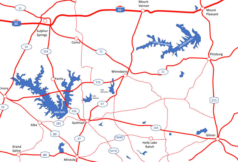 This area of the country is known for lakes, rolling hills, and pine trees. Within 30 minutes of downtown Mount Pleasant, you can be on the shores of Lakes Bob Sandlin, Cypress Springs, and Monticello. Spend the weekend on the water enjoying fishing at its finest. Camp and explore the trails in